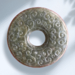 The Spring and Autumn Period jade pendant with cloud and groove patterns is an ancient jade ornament of exquisite craftsmanship and elegant design. The entire piece is circular with a central hole, carved entirely from green jade. The surface is decorated with fine, flowing cloud and groove patterns, clearly defined in their lines. These cloud and groove patterns symbolize auspicious clouds and the energy of heaven and earth, signifying good fortune, continuity, and harmony. Such jade pendants were often used as ceremonial ornaments by nobles or as burial objects, reflecting not only the high level of jade craftsmanship during the Spring and Autumn Period but also the profound understanding of ritual and the way of nature held by society at that time.